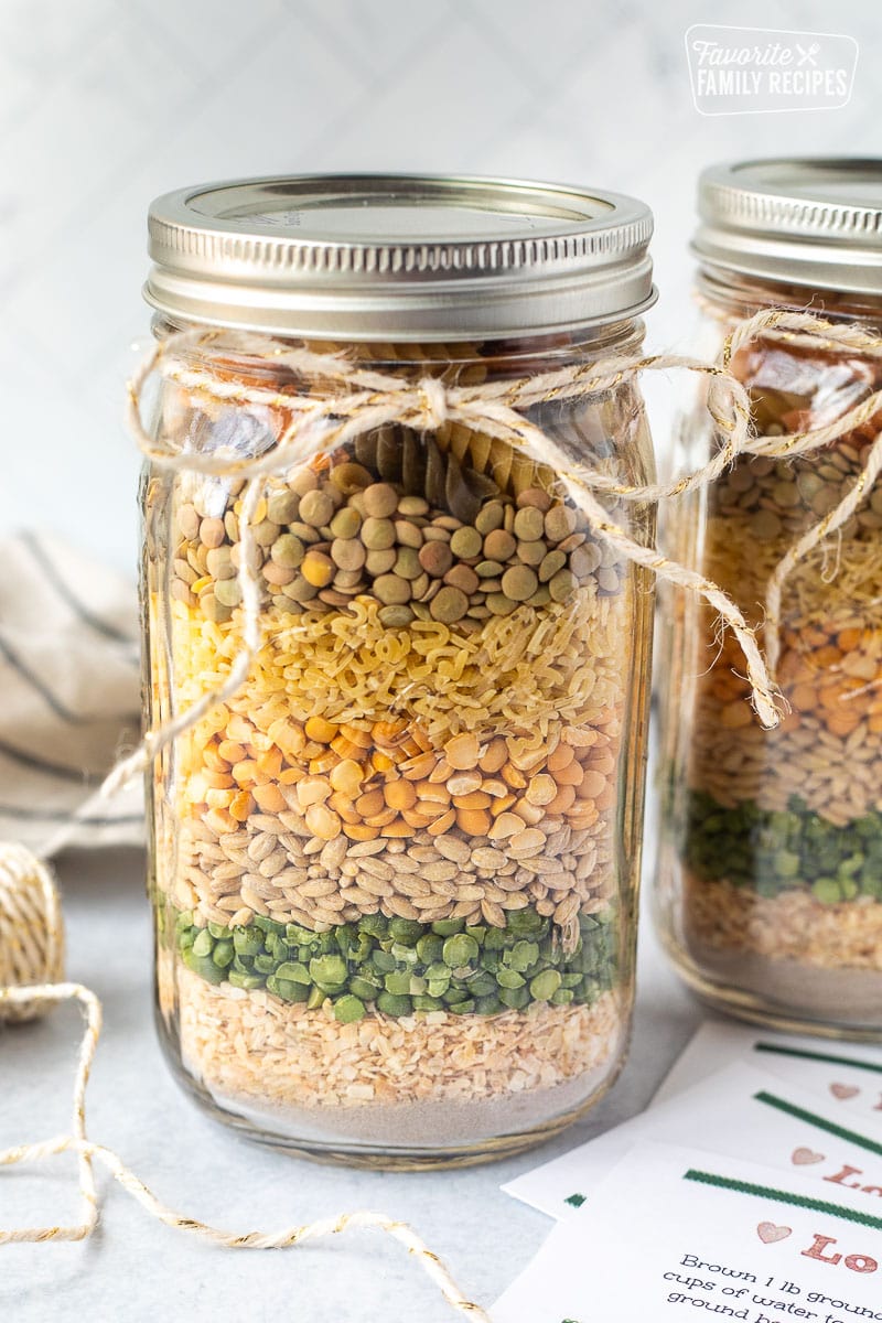 Esta sopa en frasco es un regalo muy divertido para preparar y regalar a amigos y familiares. Nos encanta preparar varias durante las fiestas y obsequiarlas a vecinos, compañeros de trabajo, niñeras, líderes religiosos y amigos. Se ve preciosa en capas dentro de un frasco con una linda etiqueta. ¡Además, la sopa está riquísima! Es muy fácil de preparar y reconfortar en cualquier noche fría de invierno. También me gusta preparar varias porciones para mí y guardarlas en bolsas Ziploc en el despensa para tener listas de comidas para el almuerzo o la cena.