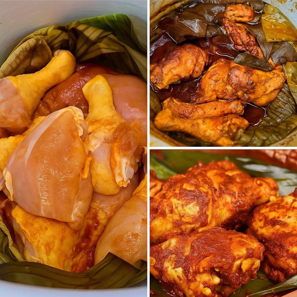 La técnica del vapor es crucial en esta preparación, ya que permite que el pollo se cocine uniformemente mientras absorbe los aromas de las especias, las hojas de plátano y el propio vapor aromático que circula durante horas de cocción lenta. Este método preserva la jugosidad natural de la carne mientras desarrolla texturas tiernas que literalmente se desprenden del hueso.