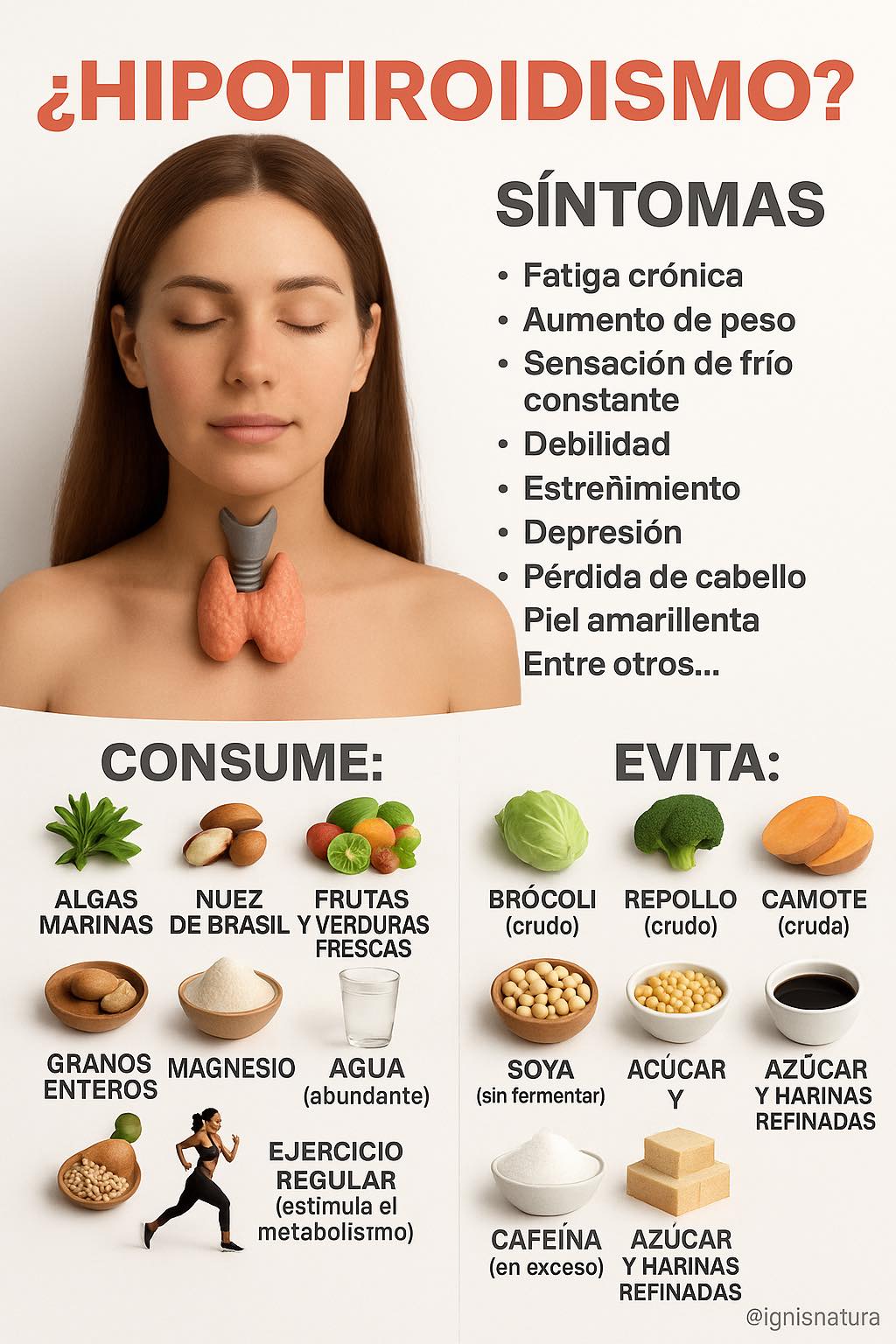 Si tu diagnóstico médico es hipotiroidismo. Procura bajar de peso, aunque sea difícil, tu cabello se vuelve denso, te vuelves más frío o puede elevar tu temperatura corporal.