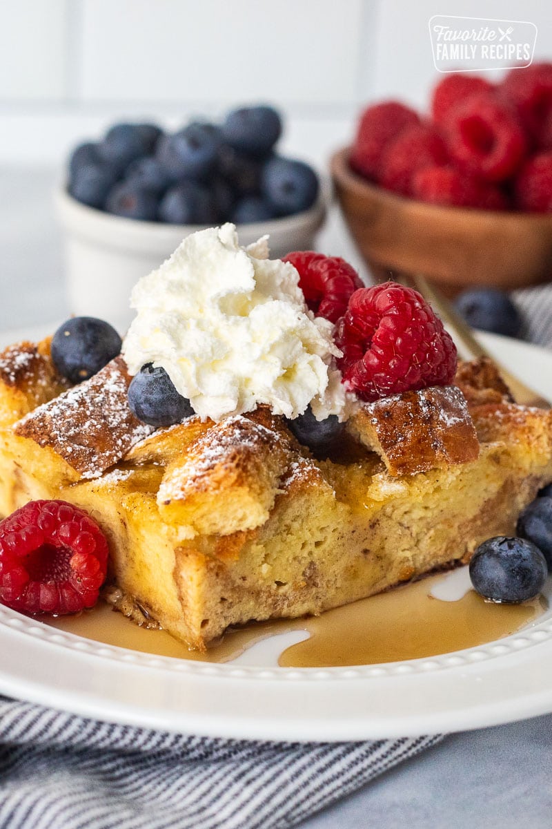 French toast is already a breakfast and brunch classic, but turn it into a casserole and you have yourself something more like bread pudding, my absolute favorite dessert. Super soft and fork tender, you’ll love how almost creamy and custardy this turns out! In this recipe, I cube the bread. This allows the bread to absorb all the liquid better and become the perfect consistency you are looking for. I also use brioche, this bread is best for French toast, but especially French toast casserole because the soft and thick texture of this bread makes it easy for it to soak up all of the egg mixture. It holds on to the liquids and flavors perfectly. Enjoy this at your next brunch! How could you not?!