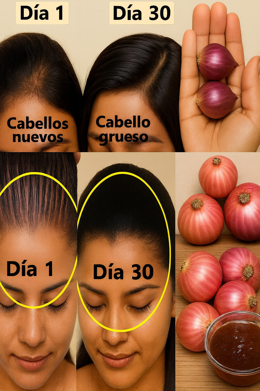 ¿Miras tu peine lleno de mechones caídos y sientes un vacío en el alma, entradas que avanzan como un desierto implacable o un cabello fino que se rinde ante el viento más suave? Esa caída no es un veredicto del destino; es un grito silencioso de folículos asfixiados por estrés, hormonas traidoras y nutrientes ausentes, rogando por un detonante que los haga nacer de nuevo, gruesos, largos y llenos de vida. Imagina esto: un jugo potente de cebolla roja –esa humilde aliada de tu cocina–, mezclado con aceite de coco cremoso y gel de aloe vera calmante, que penetra profundo en el cuero cabelludo, inunda raíces con azufre regenerador y despierta cabello nuevo como loco en solo 30 días, fuerte como raíces ancestrales y brillante como diamantes bajo el sol. Este remedio casero no es un mito de abuelas; es un arsenal capilar que estimula mitosis folicular, bloquea DHT hormonal y nutre queratina para una melena que crece 1-2 cm extra al mes, densificándose hasta cubrir calvicie y convirtiendo mechones débiles en una cascada indomable. ¿Sientes ese cosquilleo de anticipación, esa urgencia por tocar baby hairs brotando y sentir el peso de una cabellera revitalizada? Sigue leyendo, porque este ritual –aplicado 2-3 veces por semana– no solo hace nacer cabello nuevo: te devuelve la confianza de una corona poderosa, donde cada aplicación es un renacimiento que te hace reina o rey de tu propio reflejo. Prepárate para un viaje de 30 días que transforma la caída en explosión de crecimiento, el olor en un sacrificio dulce por una melena eterna.