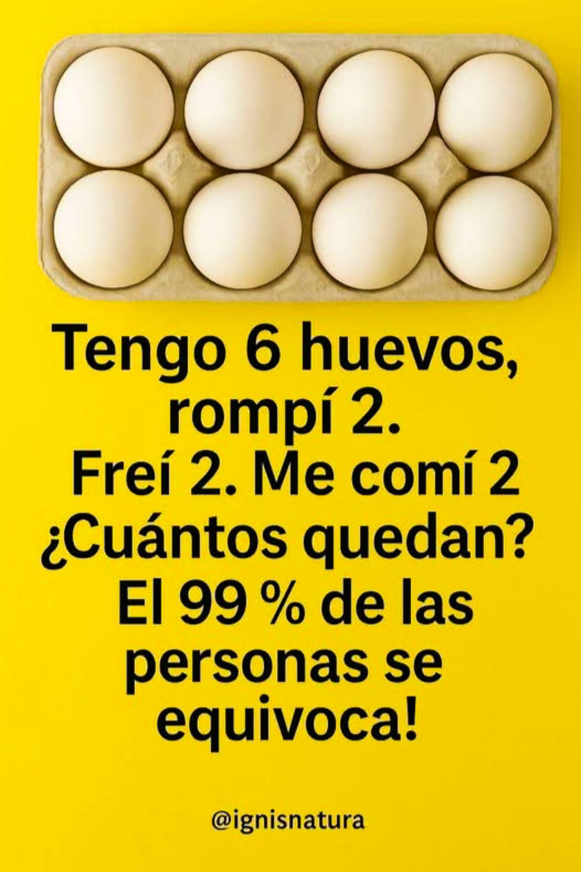 En redes sociales se ha viralizado una adivinanza que, aunque parece fácil, ha confundido a millones de personas. La frase dice:“Tengo 6 huevos. Rompí 2. Freí 2. Me comí 2. ¿Cuántos huevos me quedan?”