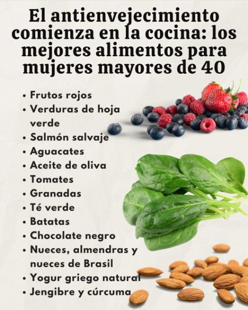 La alimentación es una de las mejores armas contra el envejecimiento. Después de los 40, el cuerpo empieza a cambiar: disminuye el colágeno, se reduce la masa muscular, las hormonas fluctúan y la piel pierde firmeza. Sin embargo, lo que comes puede ayudarte a mantener energía, retrasar la aparición de arrugas y prevenir enfermedades.