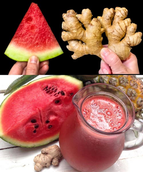 Coloca la sandía, la zanahoria, la remolacha y el jengibre en una licuadora. Mezcla hasta obtener una textura homogénea. -