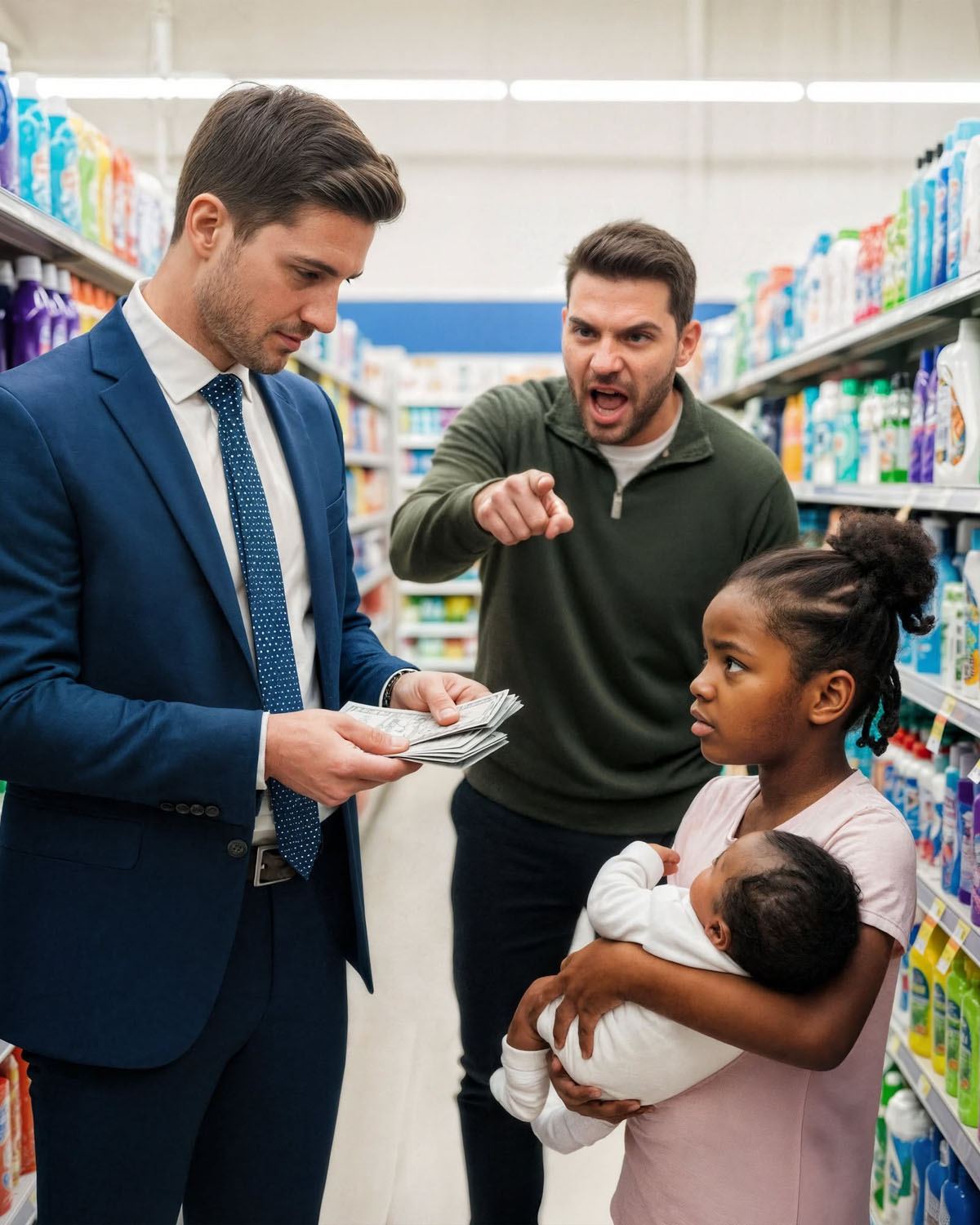 La tienda se paralizó. Los clientes se detuvieron, con las cestas suspendidas en el aire. La cajera frunció el ceño y señaló a la niña, incrédula. —¡Oye! No puedes irte con eso. Déjalo o llamo a la policía.