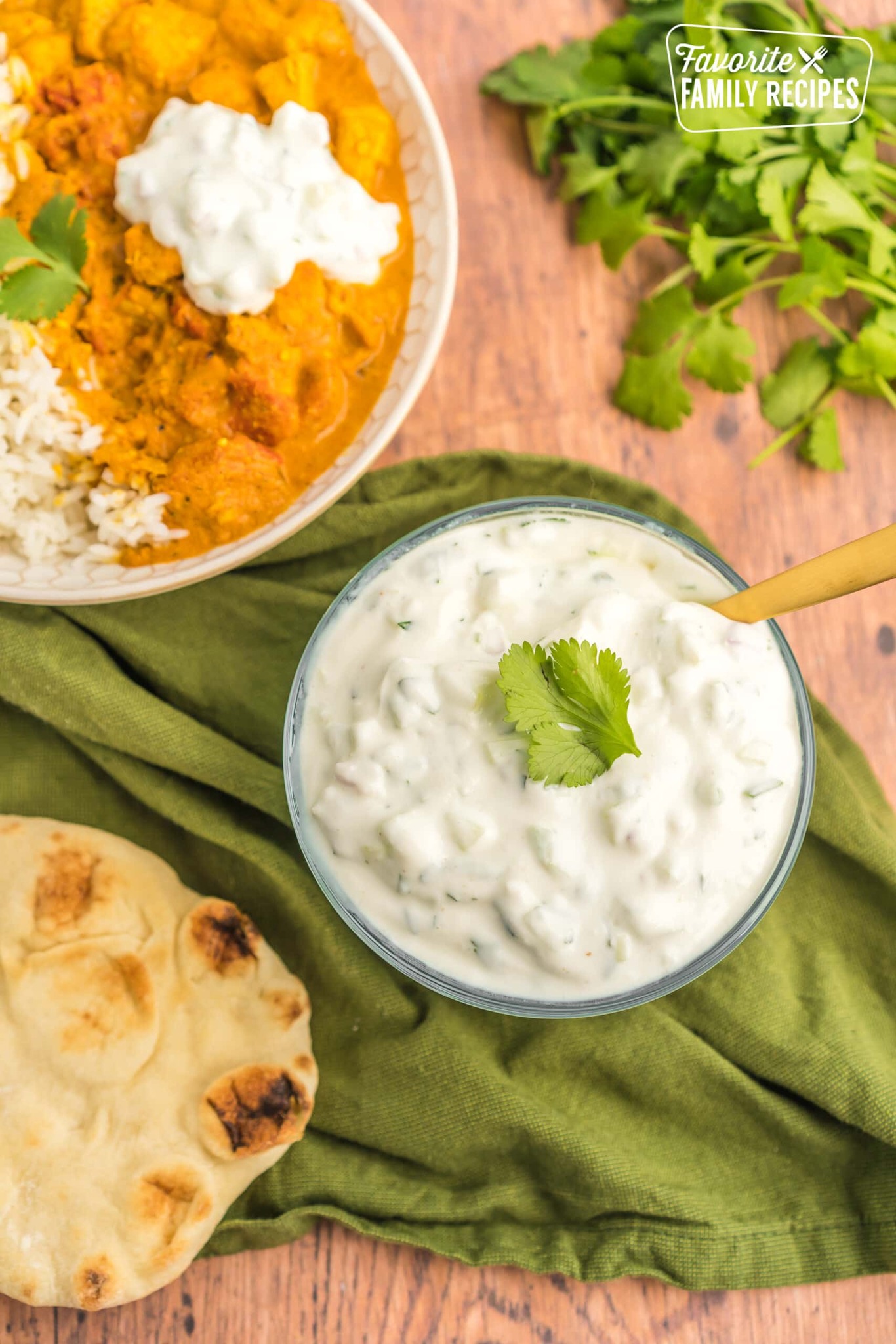 La raita es una guarnición tradicional india hecha con yogur (llamado dahi en hindi) mezclado con verduras, hierbas o incluso fruta. Mi favorita es esta receta de raita de pepino : el yogur cremoso, el pepino crujiente, el cilantro fresco y la cebolla crean una combinación sencilla pero deliciosa. En la cocina india, se considera un ingrediente esencial de la comida, ya que equilibra el picante y le da un toque único.