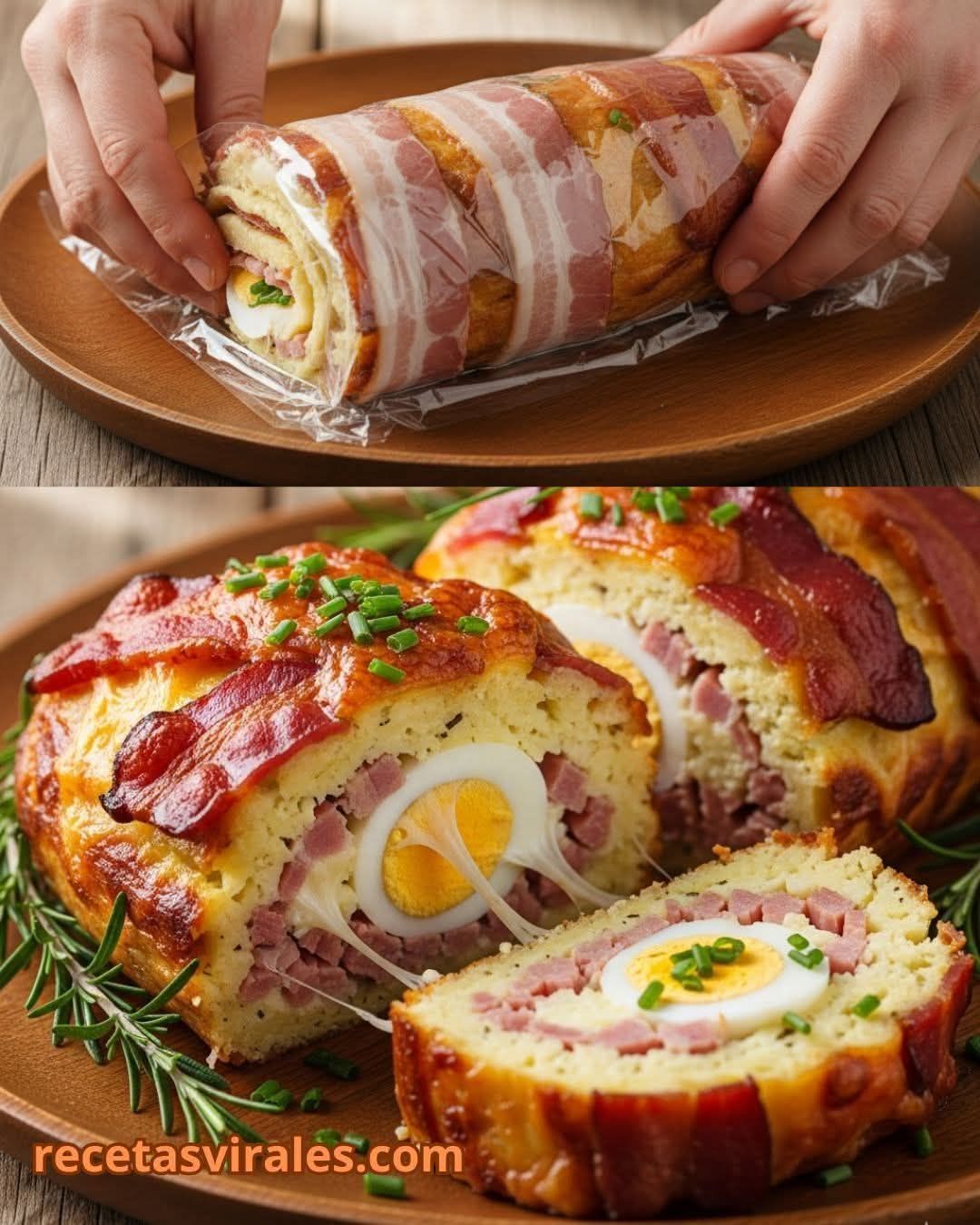 Lo que ha hecho viral a esta receta es su presentación en forma de rollo, donde el bacón forma una capa crujiente y dorada que envuelve un interior suave de puré de patata.