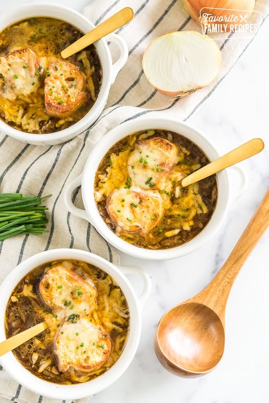 Me encanta preparar esta sopa en otoño, cuando las cebollas están en su punto más dulce. ¿El caldo intenso y sabroso, acompañado de un queso dorado y cremoso y un pan suave pero crujiente? Absolutamente irresistible. Y aquí está mi secreto: consomé de res . Le aporta un sabor intenso que el caldo de res normal no puede igualar. Si nunca lo has usado, lo puedes encontrar en el pasillo de sopas enlatadas, generalmente junto al caldo de res.